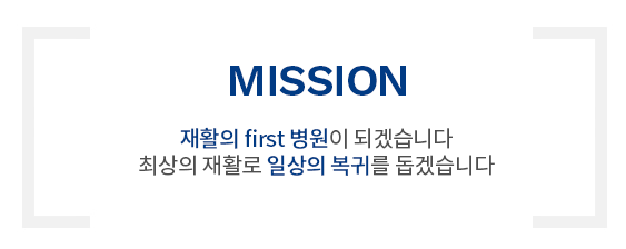 MISSION & VISION 미션 & 비젼 Home따뜻하고 편안한 병원 Effort최상의 재활치료로 환자들의 일상복귀를 위해 노력하는 병원 Advance최첨단 의료장비와 의료기술 도입을 통해 지속적으로 발전하는 병원 Listen직원, 환자, 보호자와 적극적으로 소통하는 병원